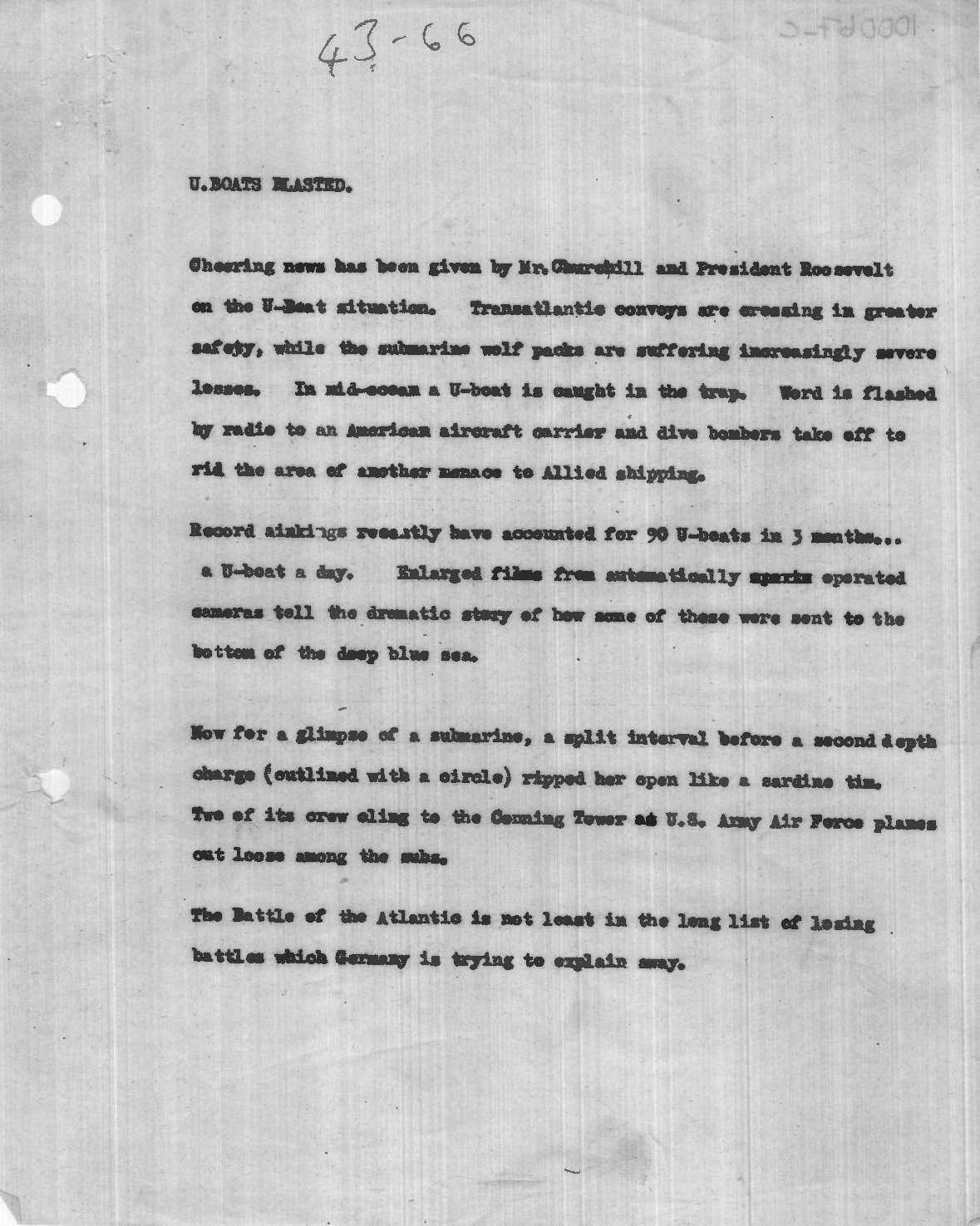 Commentary, 'U-Boats Blasted', Pathe Gazette Issue No. 43/66, 19 Aug 1943. https://learningonscreen.ac.uk/newsonscreen/search/index.php/document/100067_commentary (Accessed 21 Nov 2025)