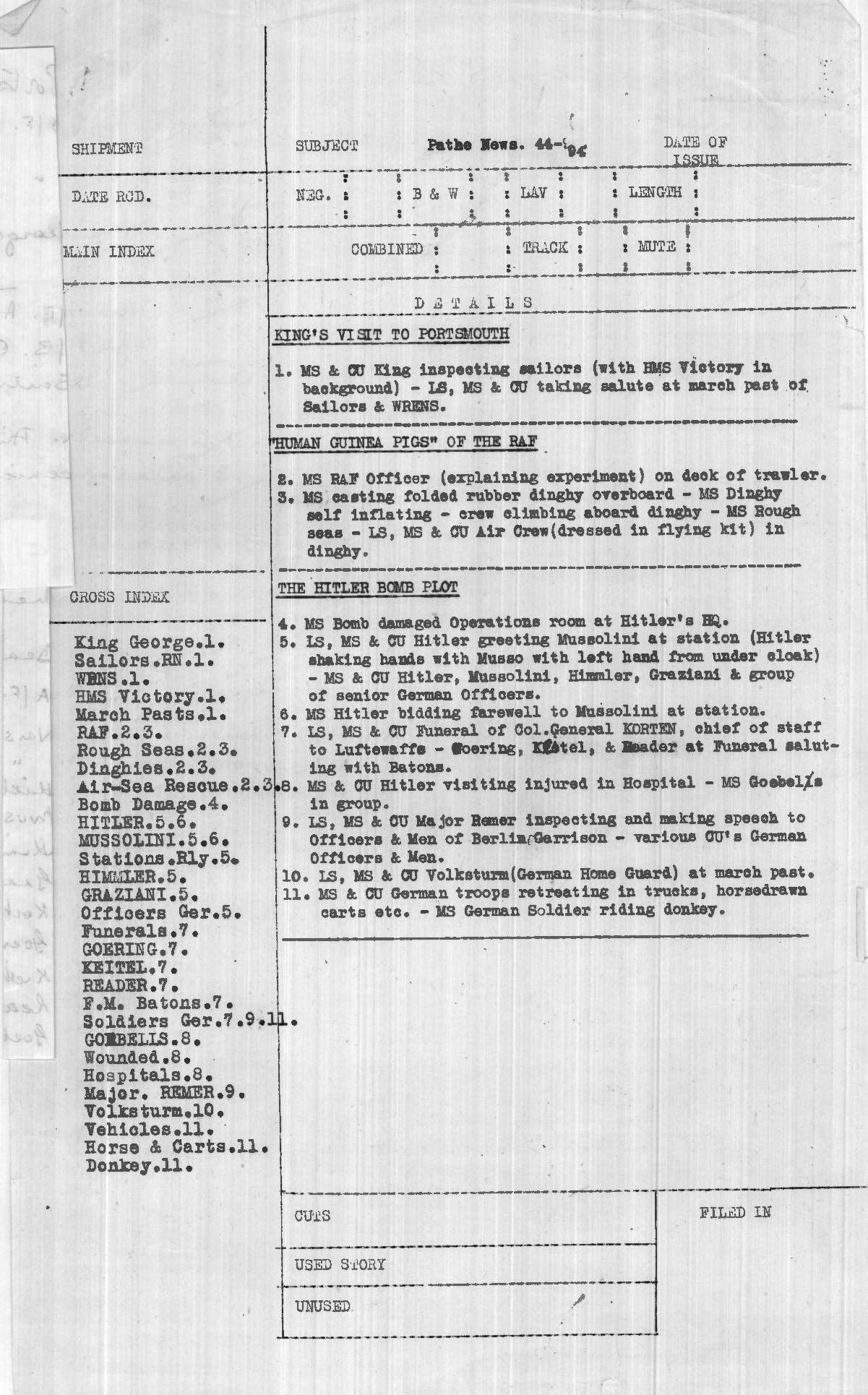 Shot List, 'The Hitler Bomb Plot - Unsuccessful Attempt on Hitler’s Life', Pathe Gazette Issue No. 44/94, 23 Nov 1944. https://learningonscreen.ac.uk/newsonscreen/search/index.php/document/100550_shotlist (Accessed 15 Oct 2025)
