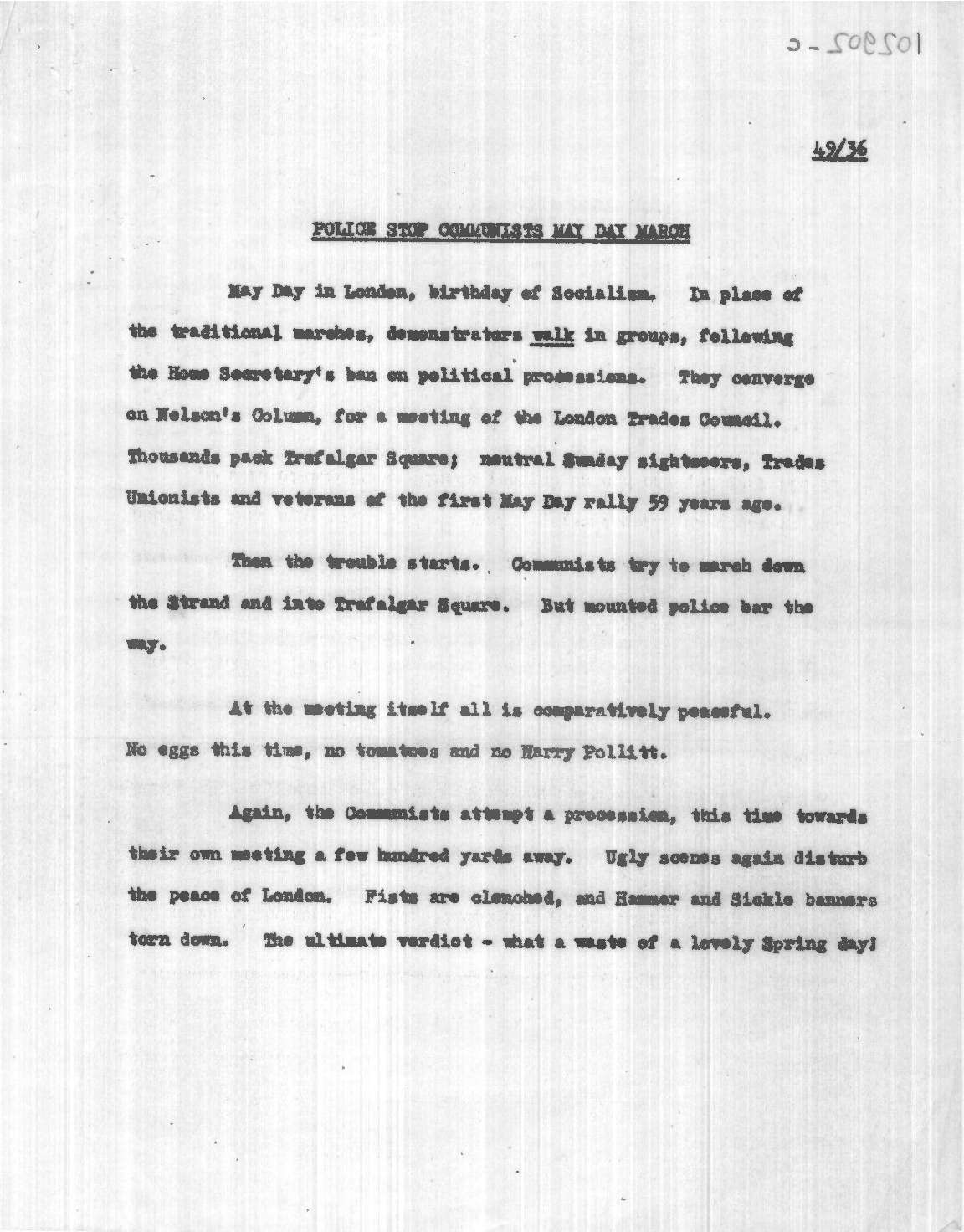 Commentary, 'Police Halt Communists May Day March', Pathe News Issue No. 49/36, 5 May 1949. https://learningonscreen.ac.uk/newsonscreen/search/index.php/document/102902_commentary (Accessed 06 Nov 2025)