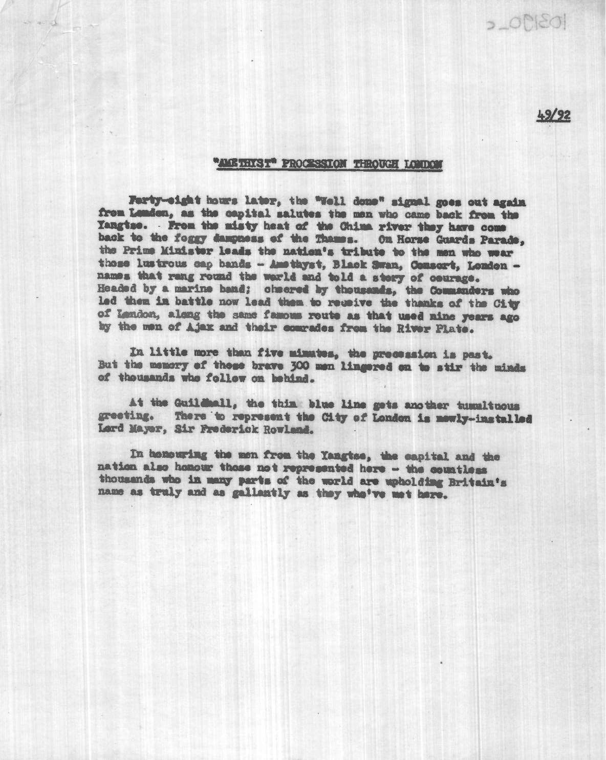 Commentary, 'London Honours Yangtse Men', Pathe News Issue No. 49/92, 17 Nov 1949. https://learningonscreen.ac.uk/newsonscreen/search/index.php/document/103190_commentary (Accessed 15 Jan 2026)