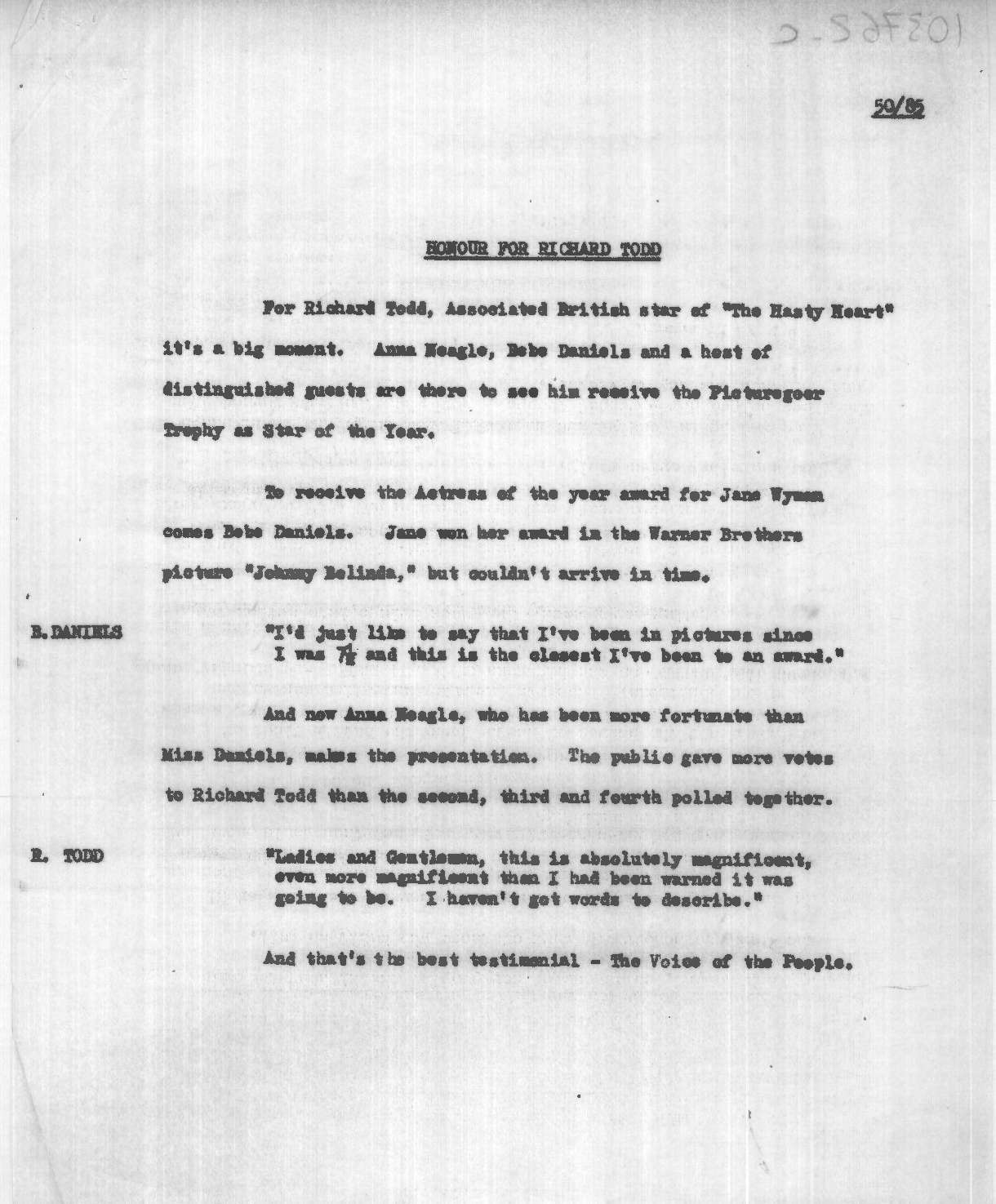 Commentary, 'Honour for Richard Todd', Pathe News Issue No. 50/85, 23 Oct 1950. https://learningonscreen.ac.uk/newsonscreen/search/index.php/document/103762_commentary (Accessed 13 Nov 2025)