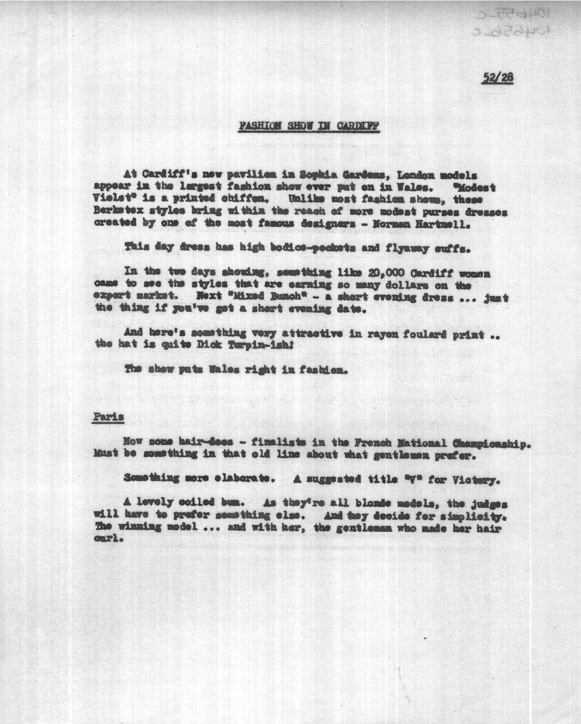 Commentary, 'Fashion Show in Cardiff', Pathe News Issue No. 52/28, 3 Apr 1952. https://learningonscreen.ac.uk/newsonscreen/search/index.php/document/104655_commentary (Accessed 25 Mar 2026)