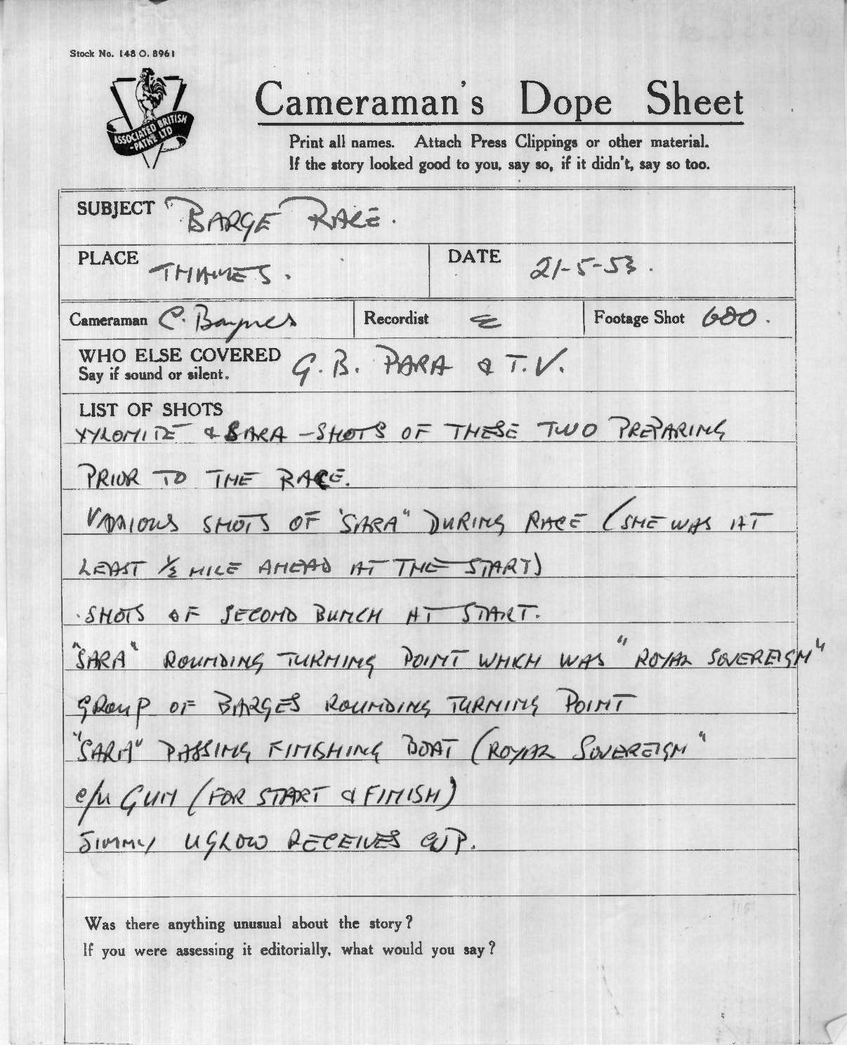 Dope Sheet, 'Thames Barge Race', Pathe News Issue No. 53/38, 25 May 1953. https://learningonscreen.ac.uk/newsonscreen/search/index.php/document/105338_dope (Accessed 24 Mar 2026)