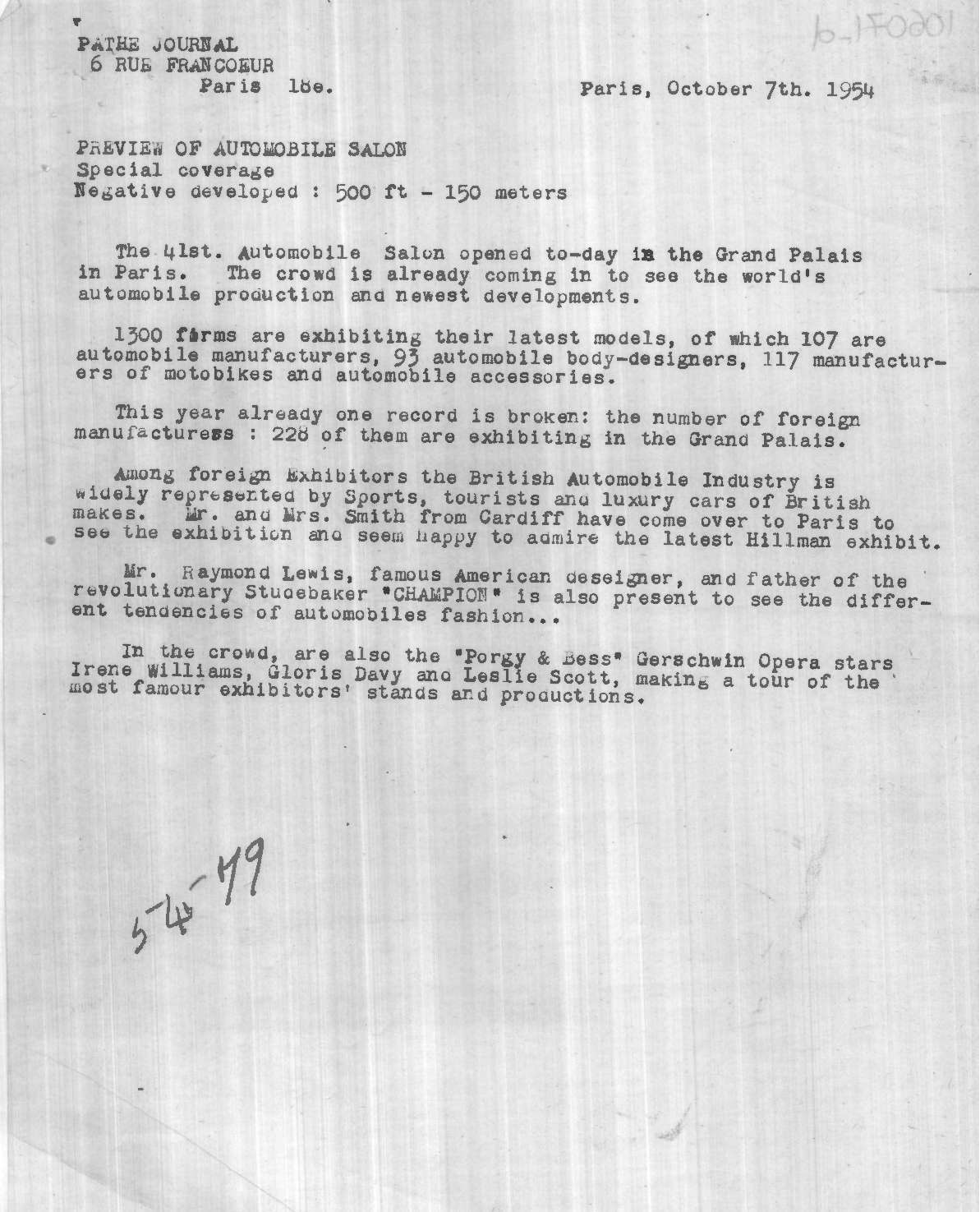 Dope Sheet, 'British Cars At Paris Motor Show', Pathe News Issue No. 54/79, 11 Oct 1954. https://learningonscreen.ac.uk/newsonscreen/search/index.php/document/106071_dope (Accessed 28 Jan 2026)