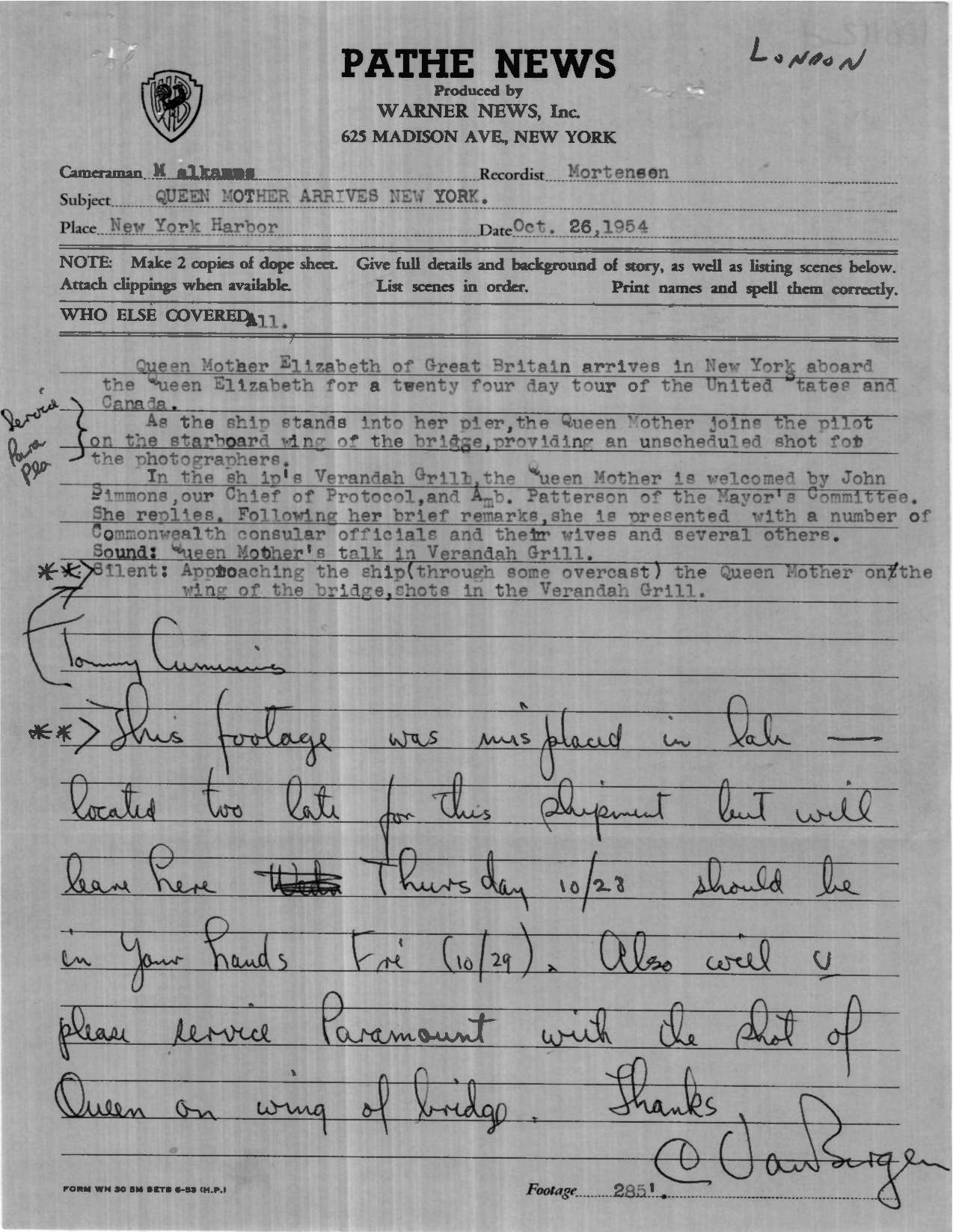 Dope Sheet, 'New York Greets Queen Mother', Pathe News Issue No. 54/85, 1 Nov 1954. https://learningonscreen.ac.uk/newsonscreen/search/index.php/document/106112_dope (Accessed 06 Feb 2026)