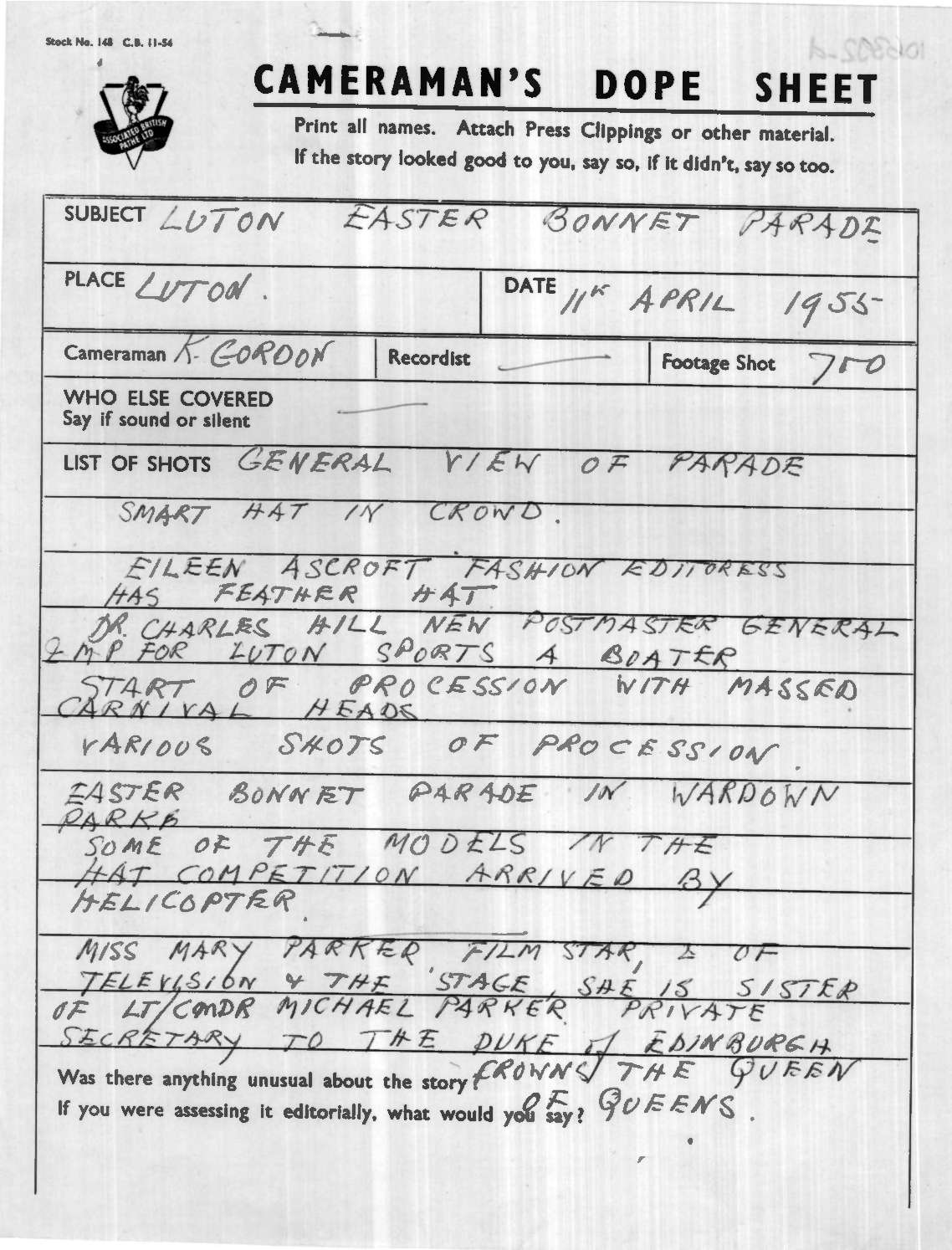 Dope Sheet, 'Easter Parade: Easter Hat Parade', Pathe News Issue No. 55/30, 14 Apr 1955. https://learningonscreen.ac.uk/newsonscreen/search/index.php/document/106392_dope (Accessed 28 Mar 2026)