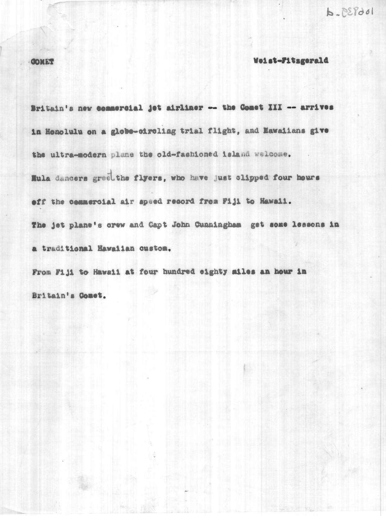 Dope Sheet, 'Comet in Hawaii', Pathe News Issue No. 55/103, 26 Dec 1955. https://learningonscreen.ac.uk/newsonscreen/search/index.php/document/106839_dope (Accessed 14 Jan 2026)