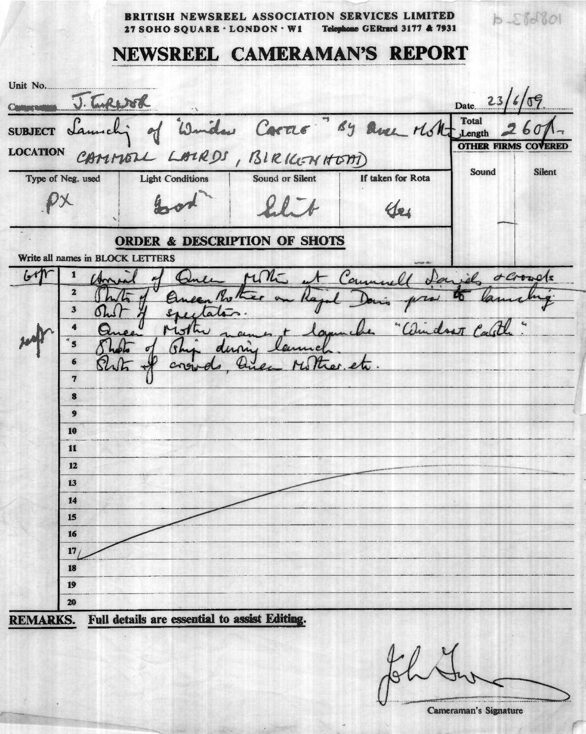 Dope Sheet, 'Queen Mother Names Liner - Birkenhead', Pathe News Issue No. 59/52, 29 Jun 1959. https://learningonscreen.ac.uk/newsonscreen/search/index.php/document/108683_dope (Accessed 25 Dec 2025)