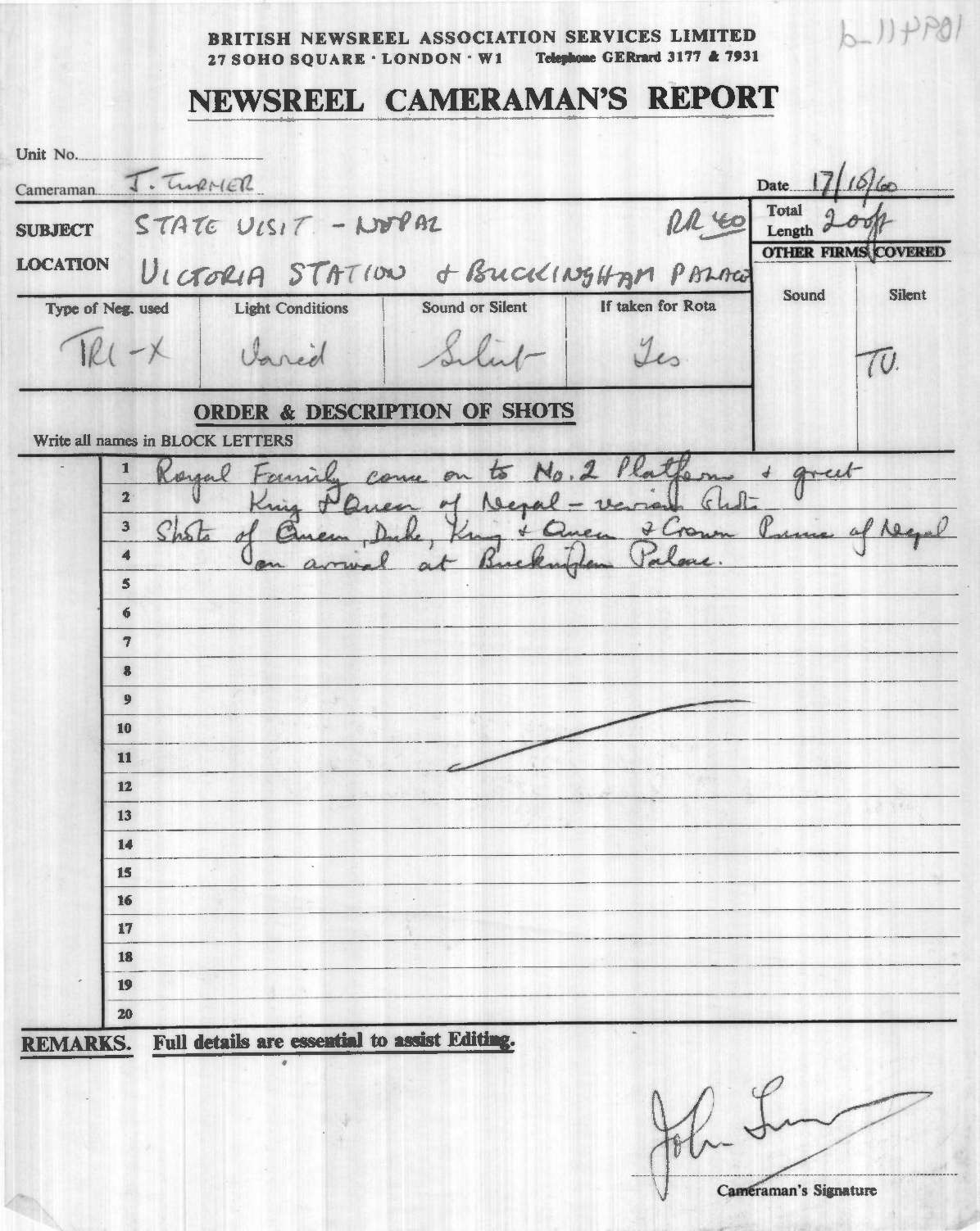 Dope Sheet, 'King of Nepal State Visit', Pathe News Issue No. 60/85, 20 Oct 1960. https://learningonscreen.ac.uk/newsonscreen/search/index.php/document/109411_dope (Accessed 21 Nov 2025)