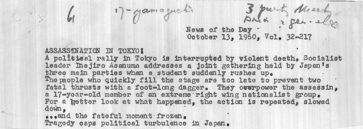Dope Sheet, 'Statesman Assassinated', Pathe News Issue No. 60/85, 20 Oct 1960. https://learningonscreen.ac.uk/newsonscreen/search/index.php/document/109413_dope (Accessed 20 Nov 2025)