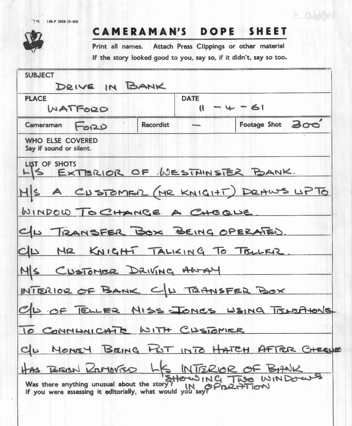 Dope Sheet, 'Bank Opens "Drive In"', Pathe News Issue No. 61/31, 17 Apr 1961. https://learningonscreen.ac.uk/newsonscreen/search/index.php/document/109660_dope (Accessed 01 Oct 2025)