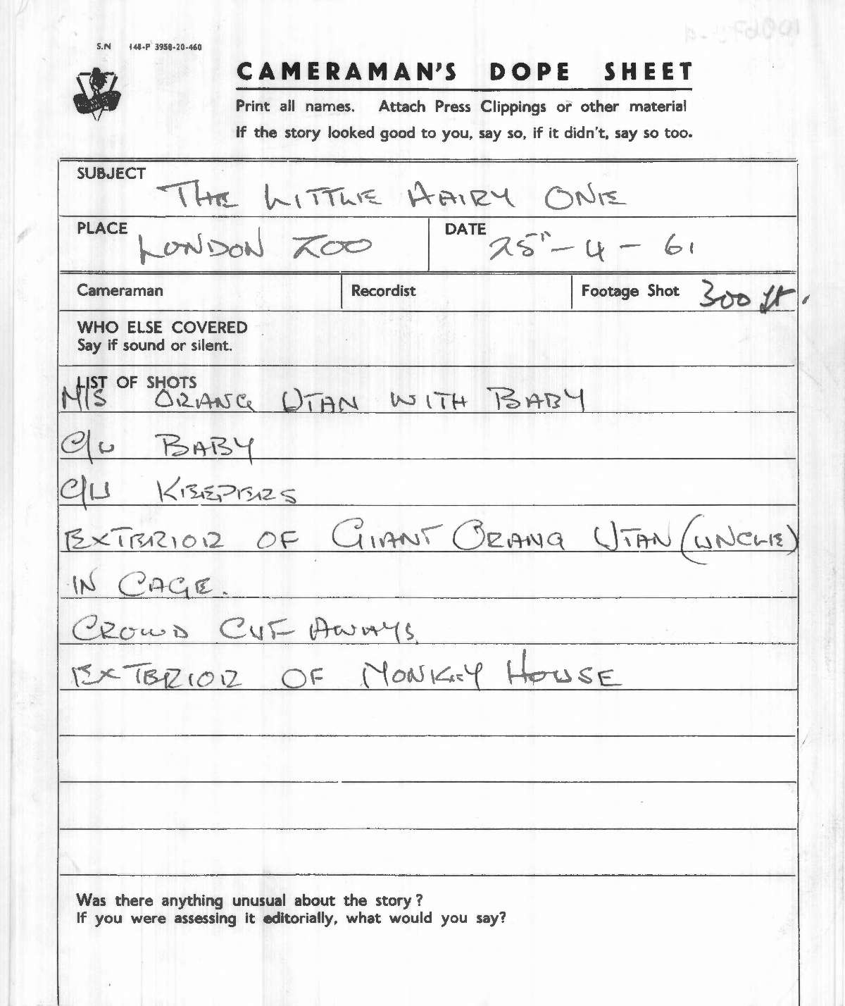 Dope Sheet, 'Meet New Zoo Baby', Pathe News Issue No. 61/35, 1 May 1961. https://learningonscreen.ac.uk/newsonscreen/search/index.php/document/109679_dope (Accessed 11 Apr 2026)