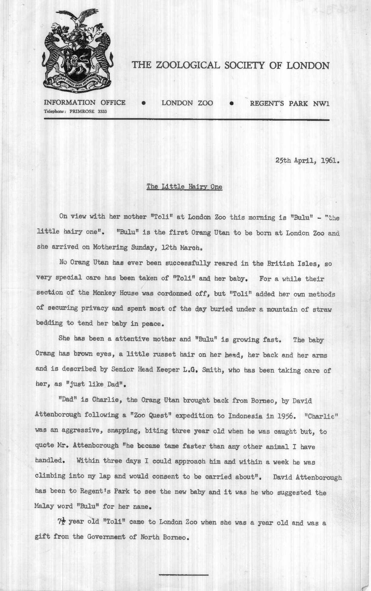 Ephemera, 'Meet New Zoo Baby', Pathe News Issue No. 61/35, 1 May 1961. https://learningonscreen.ac.uk/newsonscreen/search/index.php/document/109679_other (Accessed 02 Apr 2026)