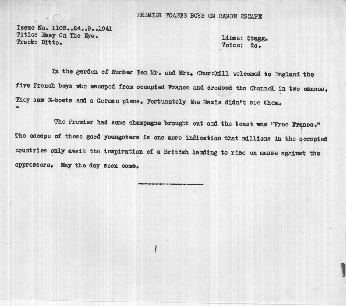 Commentary, 'Premier Toasts Boys on Canoe Escape', British Paramount News Issue No. 1103, 25 Sep 1941. https://learningonscreen.ac.uk/newsonscreen/search/index.php/document/37977_commentary (Accessed 10 Nov 2025)