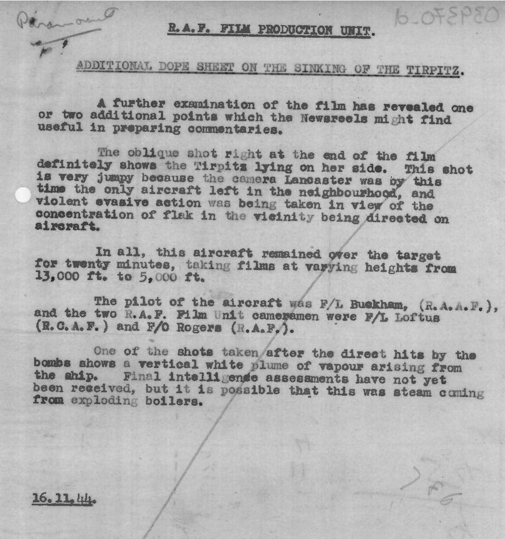 Dope Sheet, 'RAF Sink Tirpitz', British Paramount News Issue No. 1432, 20 Nov 1944. https://learningonscreen.ac.uk/newsonscreen/search/index.php/document/39370_dope (Accessed 23 Apr 2026)