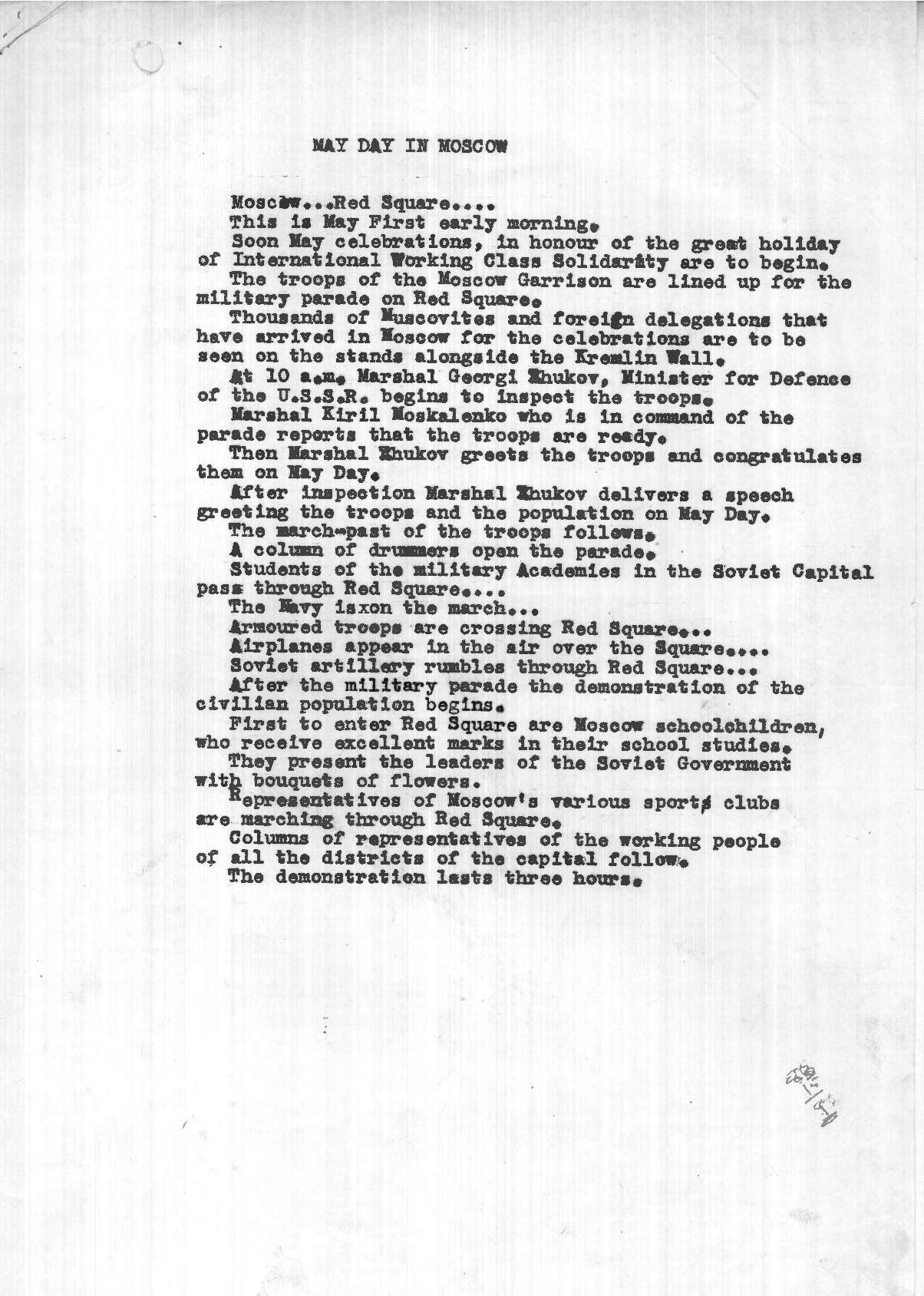 Dope Sheet, 'May Day Moscow’s Monster Parade', British Paramount News Issue No. 2628, 7 May 1956. https://learningonscreen.ac.uk/newsonscreen/search/index.php/document/46572_dope (Accessed 12 Apr 2026)