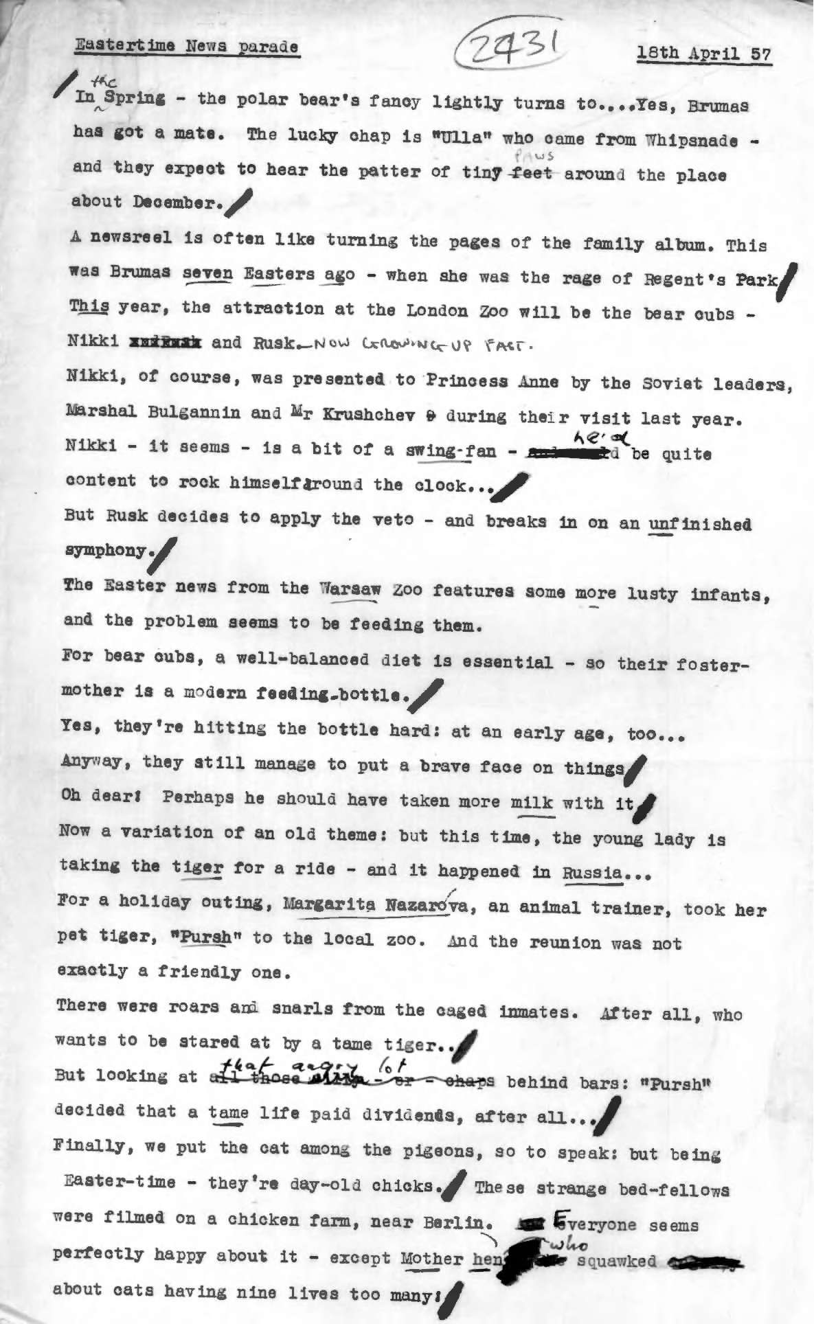 Commentary, 'Eastertime News Parade: Bear Cubs', Gaumont British News Issue No. 2431, 22 Apr 1957. https://learningonscreen.ac.uk/newsonscreen/search/index.php/document/74115_commentary (Accessed 21 Mar 2026)