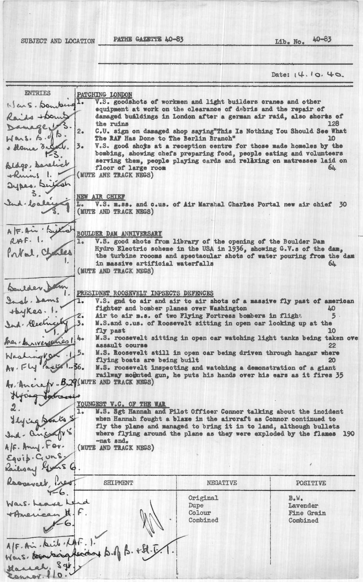 Shot List, 'President Roosevelt Inspects Defences', Pathe Gazette Issue No. 40/83, 14 Oct 1940. https://learningonscreen.ac.uk/newsonscreen/search/index.php/document/98318_shotlist (Accessed 10 Nov 2025)