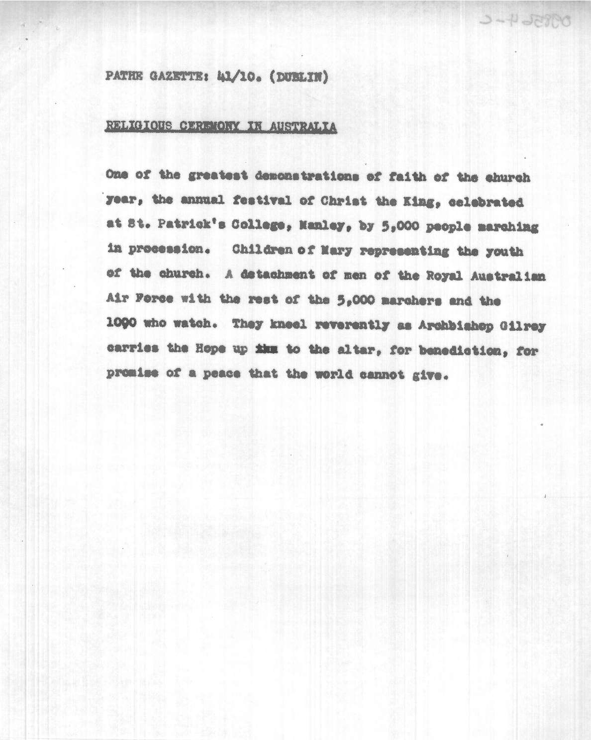 Commentary, 'Religious Festival in Australia', Pathe Gazette Issue No. 41/10, 3 Feb 1941. https://learningonscreen.ac.uk/newsonscreen/search/index.php/document/98564_commentary (Accessed 14 Nov 2025)