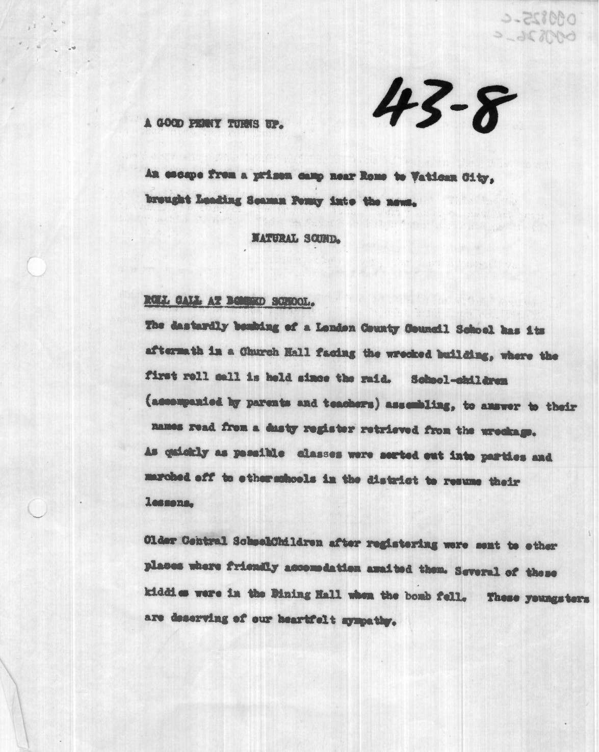 Commentary, 'Roll Call at Bombed School', Pathe Gazette Issue No. 43/8, 28 Jan 1943. https://learningonscreen.ac.uk/newsonscreen/search/index.php/document/99826_commentary (Accessed 02 Apr 2026)