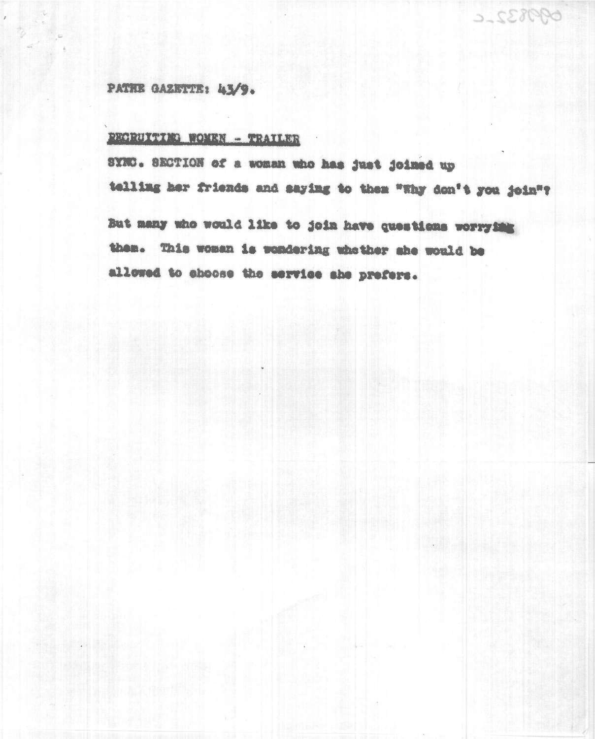 Commentary, 'Trailer: Recruiting Women', Pathe Gazette Issue No. 43/9, 1 Feb 1943. https://learningonscreen.ac.uk/newsonscreen/search/index.php/document/99832_commentary (Accessed 24 Oct 2025)